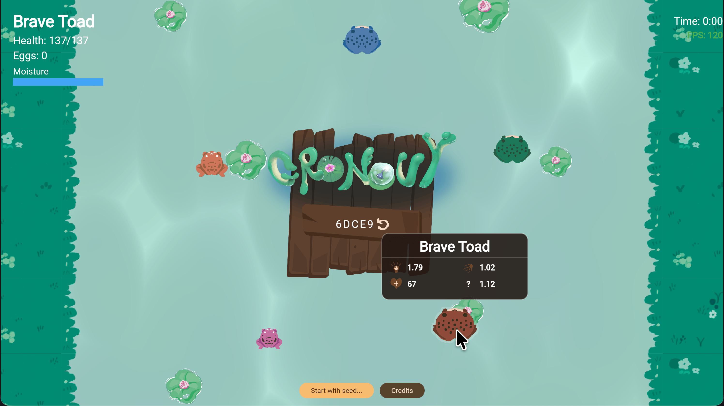 - Procedural Generation: Every frog has unique traits, name, and stats. No two runs play the same way.
